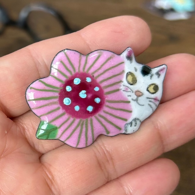 七宝焼 花ねこブローチ04