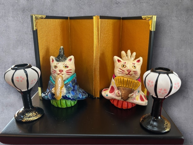 手捻りの陶芸品のお雛様です。 猫の部分のみ手捻りで作った陶芸品です。 素焼きの後絵付して本焼き。その後さらに絵付けしています。 黒い台や屏風、ぼんぼりも、付属で付いています。 台のサイズは15cm×12cmで、場所を取らず飾りやすいサイズになります。 お雛様は、一つ一つ手作りされているため、他にはないオリジナリティと特別感をお楽しみください。 ※手作り品のため、色や形に個体差があることがございます。