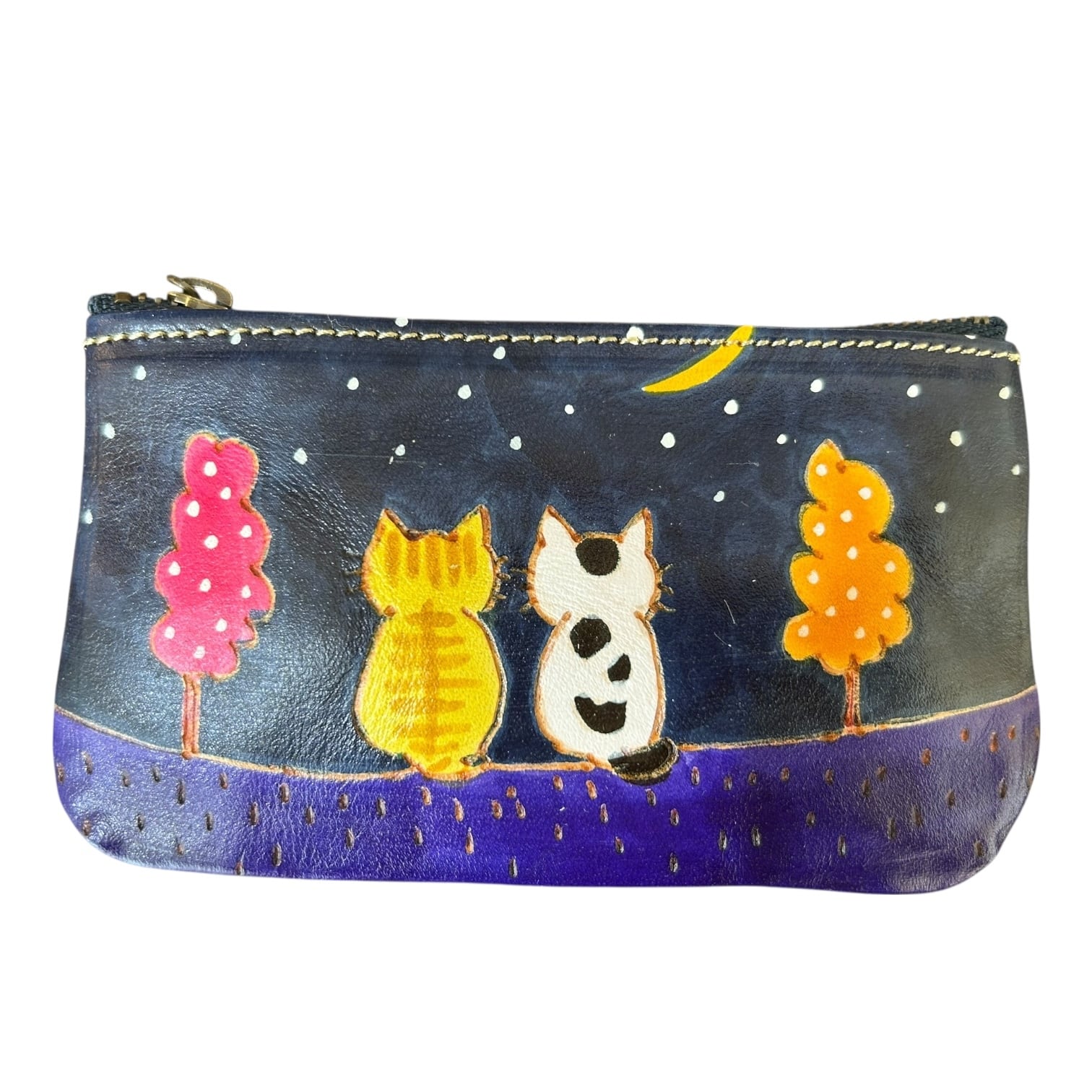 手描きの本革製ファスナー式ミニポーチです。