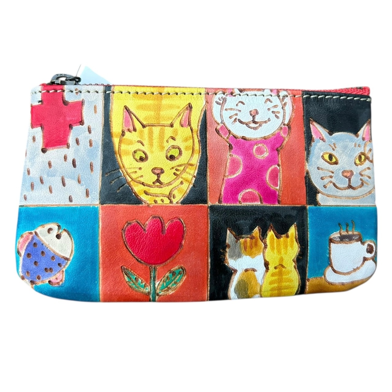 手描きの本革製ファスナー式ミニポーチです。
